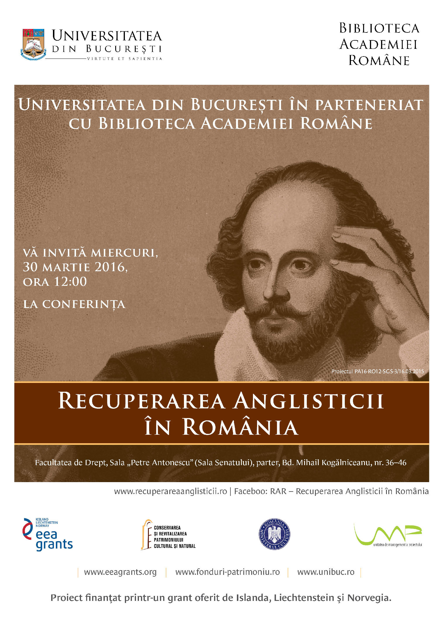Universitatea din București organizează miercuri, 30 martie 2016, conferința „R.A.R.- Recuperarea Anglisticii în România”, organizată în cadrul proiectului PA16-RO12-SGS-3/16.03.2015, realizat în parteneriat cu Biblioteca Academiei Române și finanțat prin Granturi SEE, programul „Conservarea și revitalizarea patrimoniului cultural și natural”. Evenimentul se va desfășura la Palatul Facultății de Drept a Universității din București (Bd. Mihail Kogălniceanu, nr. 36-46), sala „Petre Antonescu”, parter, începând cu ora 12:00.
