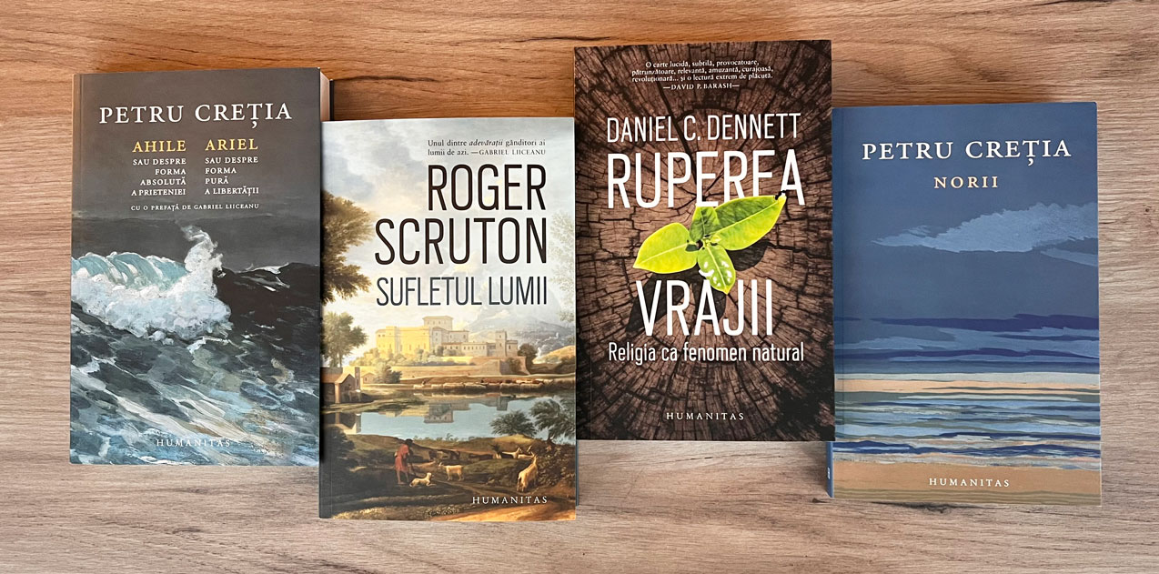 • Sufletul lumii, de Roger Scruton: „Sufletul lumii, una dintre ultimele cărți ale marelui filozof britanic, este socotită o capodoperă prin bogăția și limpezimea argumentelor. Roger Scruton își propune să doboare două tipuri de reducționism al paradigmei scientiste: mai întâi, religia nu este doar o explicație alternativă a lumii, în concurență cu cea rațională, și apoi, ea nu se reduce la un set de fenomene de resortul sociologiei sau al psihologiei evoluționiste.” (Ed. Humanitas; trad. Andreea Eșanu)