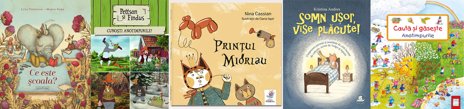Două cărți ilustrate despre anotimpuri: Pettson și Findus. Cunoști Anotimpurile? (la Panda) și Caută și găsește. Anotimpurile (la Casa), Prințul Miorlau, de Nina Cassian, cu ilustrațiile Oanei Ispir (la Frontiera) și Somn ușor, vise plăcute! Unsprezece povești și jumătate de citit înainte de culcare, scrise de Vulpe și Iepure, de Kristina Andres (la Humanitas Junior).