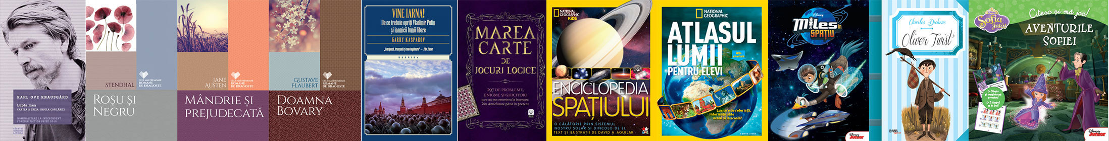 Lupta mea. Cartea a treia. Insula copilăriei, de Karl Ove Knausgård; Roșu și negru, de Stendhal; Mândrie și prejudecată, de Jane Austen; Doamna Bovary, de Gustave Flaubert; Vine iarna. De ce trebuie opriţi Vladimir Putin şi inamicii lumii libere, de Garry Kasparov; Marea carte de jocuri logice. 197 de probleme, enigme și ghicitori care au pus omenirea la încercare, din Antichitate până în prezent; Enciclopedia spațiului, de David A. Aguilar; Atlasul lumii pentru elevi, ed. National Geographic; Miles în spațiu, ed. Disney; Sofia Întâi. Aventurile Sofiei. Citesc și mă joc, ed. Disney; Oliver Twist, de Charles Dickens.