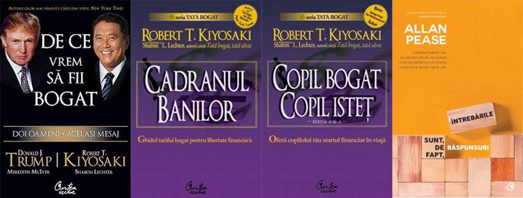 De ce vrem să fii bogat. Doi oameni - Acelaşi mesaj, de Donald J. Trump, Robert T. Kiyosaki, Meredith McIver, Sharon Lechter; Cadranul banilor. Ghidul unui tată bogat pentru libertate financiară, de Robert T. Kiyosaki, Sharon L. Lechter; Copil bogat, copil isteţ. Startul financiar în viaţă, de Robert T. Kiyosaki, Sharon L. Lechter; Întrebările sunt, de fapt, răspunsuri, de Allan Pease.