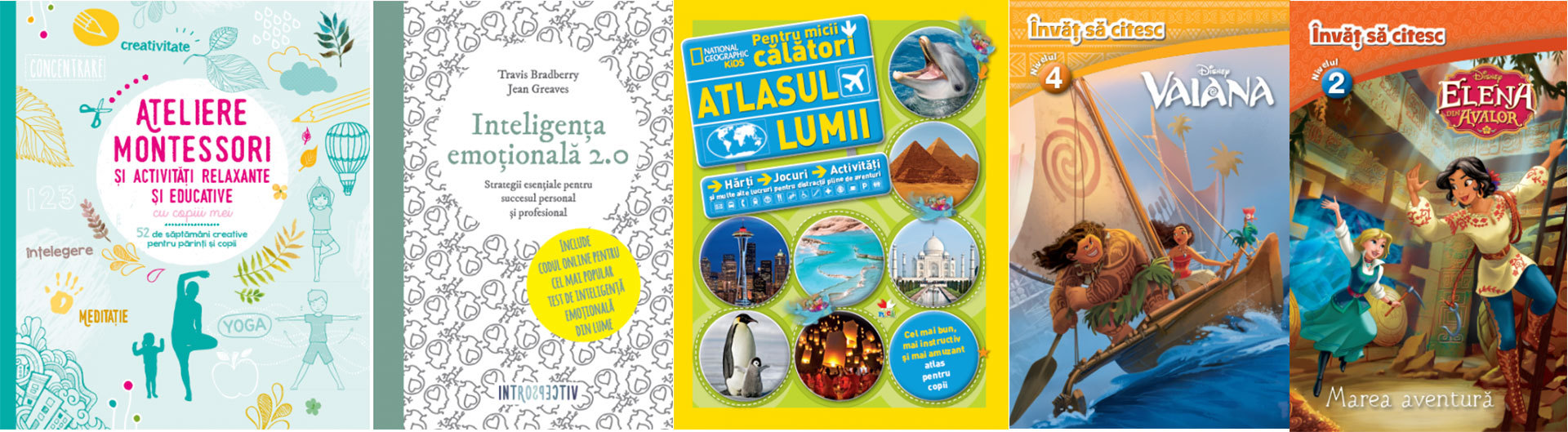 Ateliere Montessori și activități relaxante și educative cu copiii mei. 52 de săptămâni creative pentru părinți și copii; Inteligență emoțională 2.0, de Travis Bradberry, Jean Greaves; Atlasul lumii pentru micii călători, ed. National Geographic; Vaiana. Învăț să citesc (nivelul 4), ed. Disney; Elena din Avalor. Învăț să citesc (nivelul 2), ed. Disney.