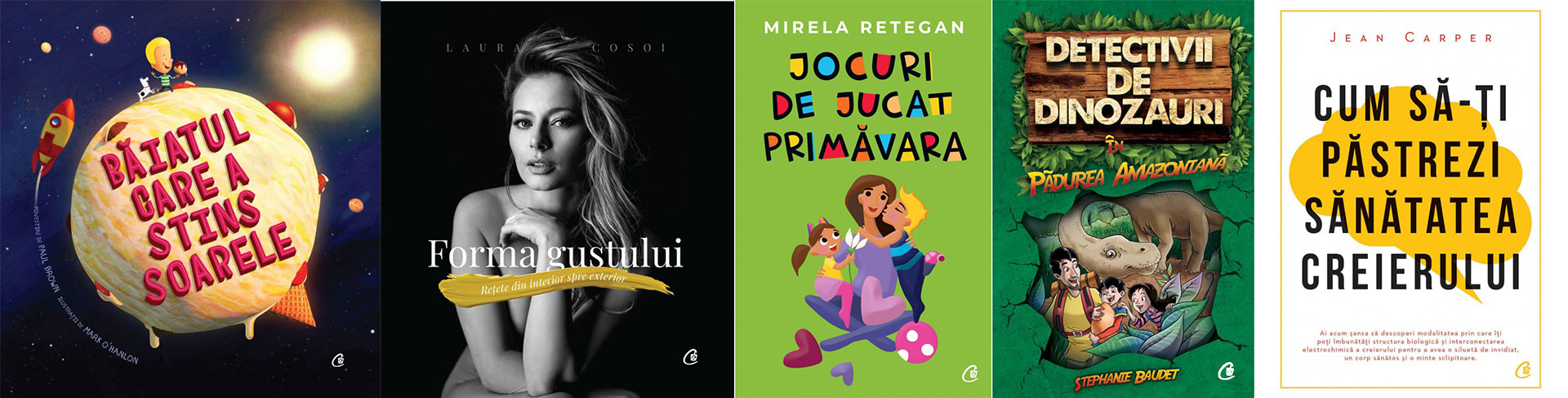 Băiatul care a stins soarele, de Paul Brown; Găina care a adus pe lume o văcuţă, de Adam Bestwick; Forma gustului, de Laura Cosoi; Eşti mai inteligent decât crezi. Un ghid al inteligenţelor multiple, pentru copii, de Thomas Armstrong; Jocuri de jucat primăvara, de Mirela Retegan; Născut anxios, de Daniel P. Keating; Căutarea cerului albastru: Mindfulness pentru fericire aici și acum, de Joseph Emet; Detectivii de dinozauri in pădurea amazoniană. Cartea întâi, de Stephanie Baudet; Cum să le vorbim copiilor astfel încât să ne asculte, de Joanna Faber, Julie King; Cum să-ţi păstrezi sănătatea creierului, de Jean Carper.