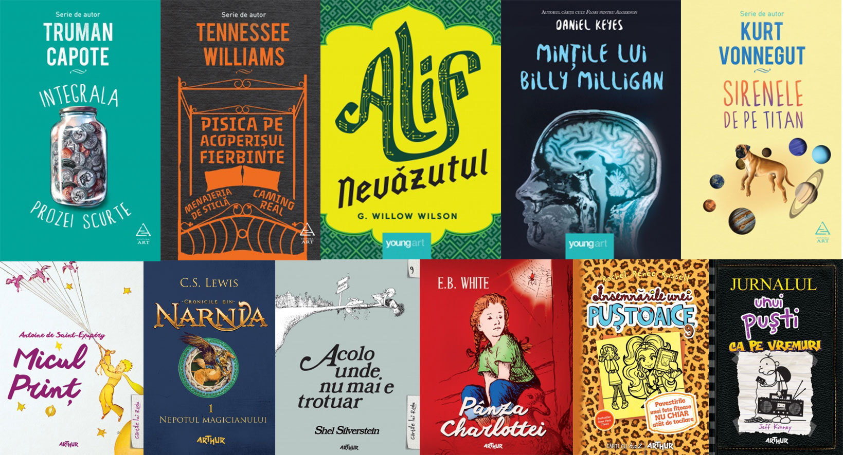 ART – Micul Prinţ, de Antoine de Saint-Exupéry; Integrala prozei scurte, de Truman Capote; Pisica pe acoperisul fierbinte. Menajeria de sticla. Camino Real, de Tennessee Williams; Alif Nevăzutul, de G. Willow Wilson; Mințile lui Billy Milligan, de Daniel Keyes; Sirenele de pe Titan, de Kurt Vonnegut; Cronicile din Narnia I. Nepotul magicianului, de C.S. Lewis; Acolo unde nu mai e trotuar / Where the Sidewalk Ends, de Shel Silverstein; Pânza Charlottei, de E. B. White; Jurnalul unui puști 10. Ca pe vremuri, de Jeff Kinney; Însemnările unei puștoaice. Povestirile unei fete fițoase nu chiar atât de tocilare (Vol. 9), de Rachel Renée Russell.