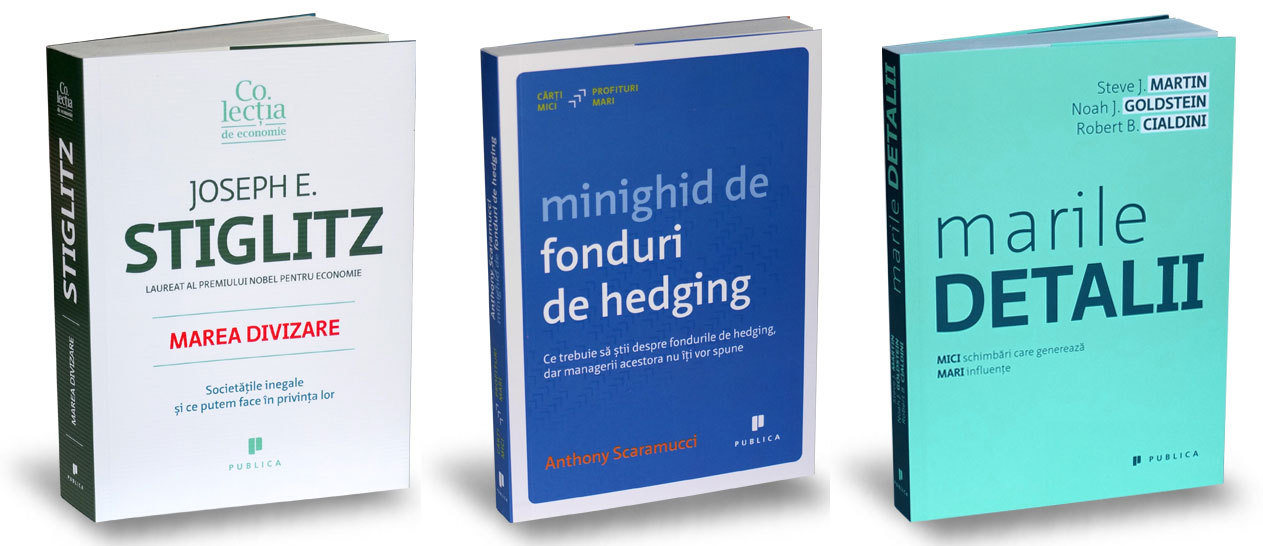 PUBLICA – Marea divizare: Societăţile inegale şi ce putem face în privinţa lor, de Joseph E. Stiglitz; Minighid de fonduri de hedging: Ce trebuie să ştii despre fondurile de hedging, dar managerii acestora nu îţi vor spune, de Anthony Scaramucci; Marile detalii: MICI schimbări generează MARI influenţe, de Noah J. Goldstein, Robert B. Cialdini, Steve J. Martin.