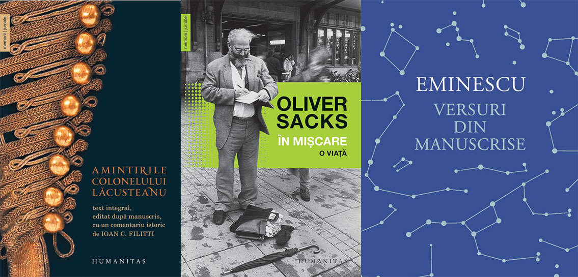 Amintirile colonelului Lăcusteanu (Text integral, editat după manuscris, cu o introducere de Ion Filitti, note de Radu Crutzescu şi un comentariu istoric de Ioan C. Filitti), de Grigore Lăcusteanu; În mișcare. O viață, de Oliver Sacks; Versuri din manuscrise, de Mihai Eminescu; Ce a fost înainte de Big Bang? O istorie întreagă a universului, de Martin Bojowald; Firida Rușinii, de Ismail Kadare; Amantul japonez, de Isabel Allende; Poftă de ciocolată, de Care Santos.
