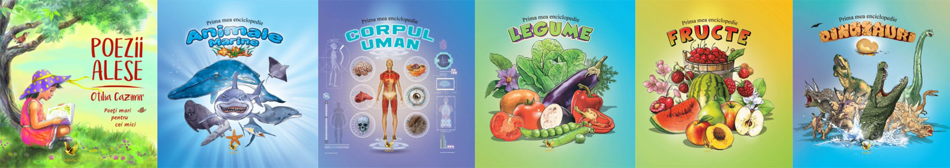 Poezii alese, de Otilia Cazimir; Prima mea enciclopedie. Animale marine; Prima mea enciclopedie. Corpul uman; Prima mea enciclopedie. Legume; Prima mea enciclopedie. Fructe; Prima mea enciclopedie. Dinozauri.