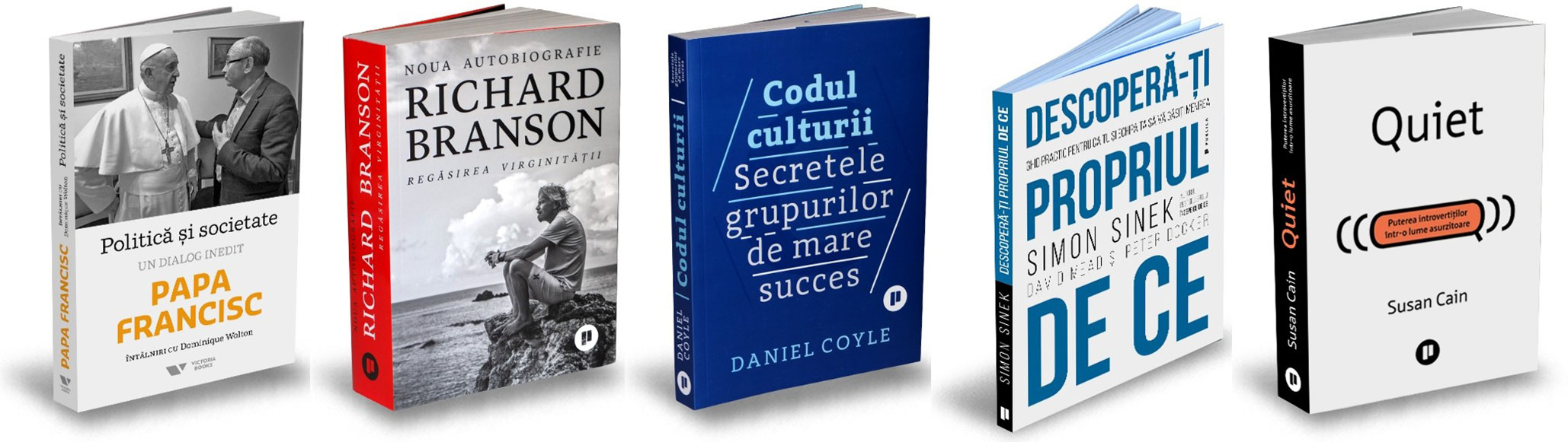 Politică și societate. Un dialog inedit, de Dominique Wolton, Papa Francisc; Regăsirea virginității. Noua autobiografie, de Richard Branson; Codul culturii. Secretele grupurilor de mare succes, de Daniel Coyle; Descoperă-ți propriul de ce. Ghid practic pentru ca tu și echipa ta să vă găsiți menirea, de David Mead, Peter Docker, Simon Sinek; Quiet. Puterea introvertiților într-o lume asurzitoare, de Susan Cain.