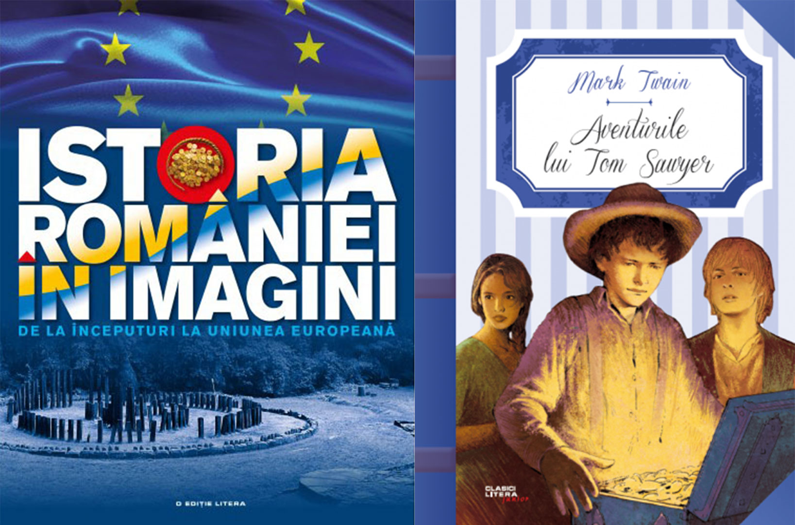 Istoria României în imagini, de Teodora Stanciu; Aventurile lui Tom Sawyer, de Mark Twain.