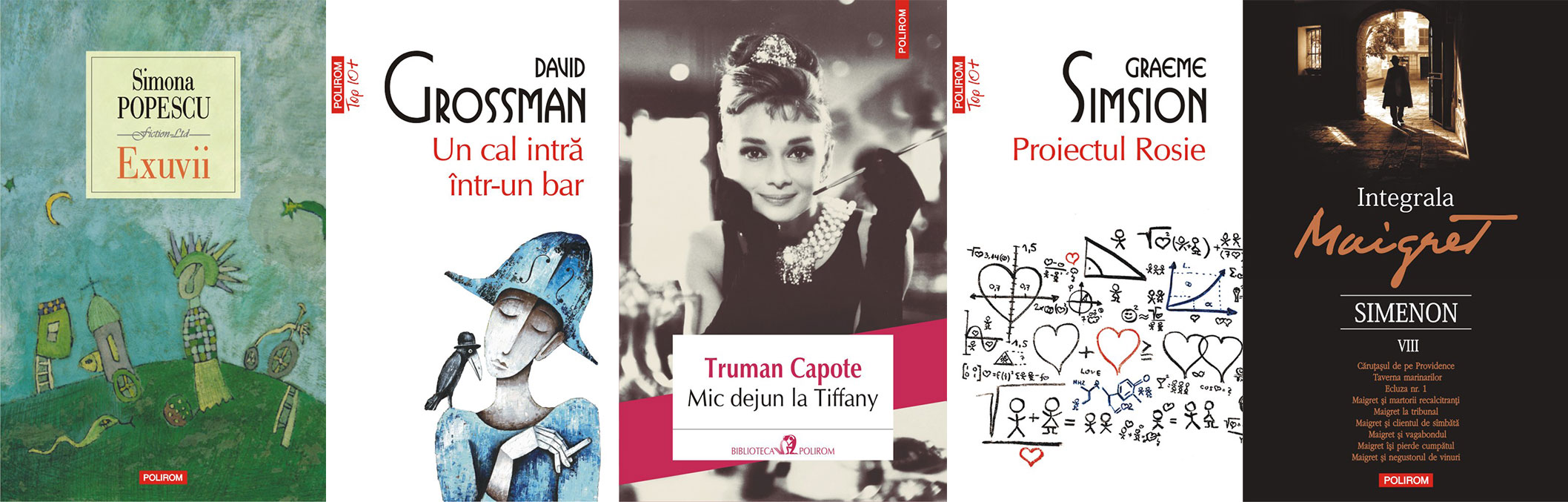 Exuvii, de Simona Popescu; Un cal intră într-un bar, de David Grossman; Mic dejun la Tiffany, de Truman Capote; Proiectul Rosie, de Graeme Simsion; Integrala Maigret. Volumul VIII, de Georges Simenon.