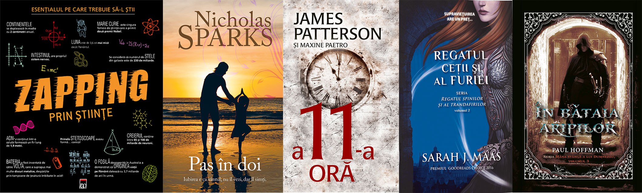 Zapping prin științe; A 11-a oră, de James Patterson și Maxine Paetro; Pas în doi, de Nicholas Sparks; Privește-mă, de Nicholas Sparks; Regatul ceții și al furiei (vol. 2), de Sarah J. Maas; În bătaia aripilor (vol. 3), de Paul Hoffman.