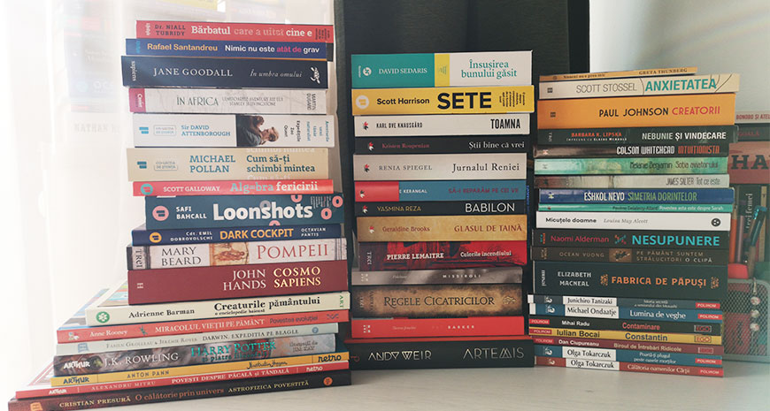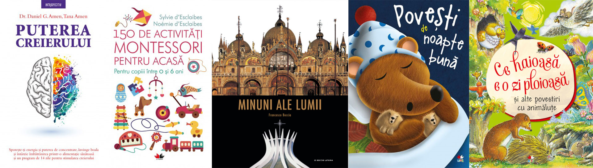 Puterea creierului, de Dr. Daniel G. Amen, Tana Amen; Zece negri mititei, de Agatha Christie; Calea. Secretele celor mai mari filosofi chinezi pentru o viață mai bună, de Michael Puett, Christine Gross-Loh; 150 de activități Montessori pentru acasă. Pentru copiii între 0 și 6 ani, de Sylvie d'Esclaibes, Noémie d'Esclaibes; Să înțelegem educația Waldorf. O privire din interior, de Jack Petrash; 250 de lucruri de încercat într-o viață - pentru cupluri, de Elise de Rijck; Minuni ale lumii, de Francesco Boccia; Motociclete. Istoria ilustrată completă, ed. DK; Povești de noapte bună; Ce haioasă e o zi ploioasă și alte povestiri cu animăluțe; Atlasul ilustrat al lumii pentru copii; Povești de aur. Cele mai frumoase povești clasice, ed. Disney; Animale sălbatice. Prima mea carte Montessori; La fermă. Carte cu ferestruici. Bebe învață; Dani, o fetiță fericită. Cele mai bune prietene, de Rose Lagercrantz, Eva Eriksson