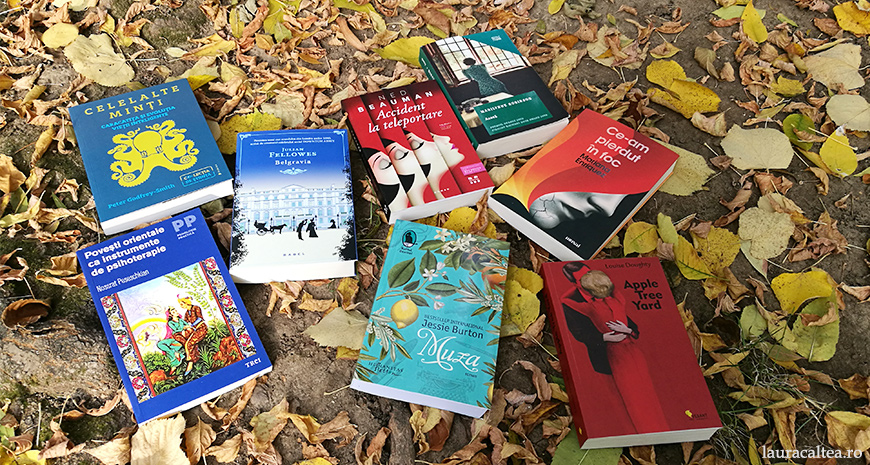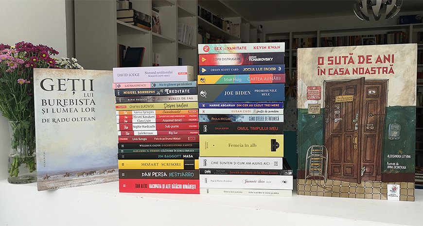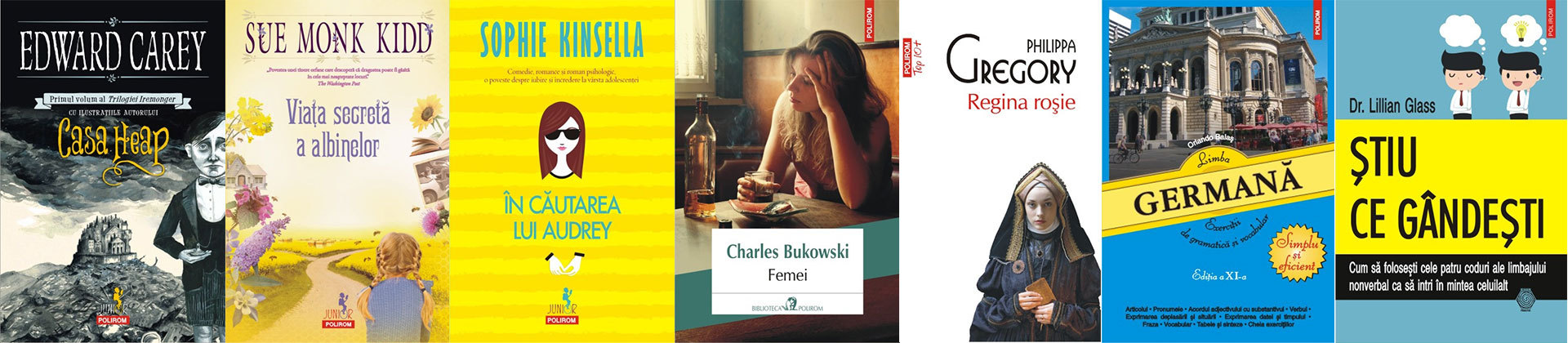 Casa Heap. Primul volum al Trilogiei Iremonger, de Edward Carey; Viața secretă a albinelor, de Sue Monk Kidd; În căutarea lui Audrey, de Sophie Kinsella; Femei, de Charles Bukowski; Regina roșie, de Philippa Gregory; Limba germană. Exerciții de gramatică și vocabular, de Orlando Balaș; Știu ce gândești. Cum să folosești cele patru coduri ale limbajului nonverbal ca să intri în mintea celuilalt, de dr. Lillian Glass.