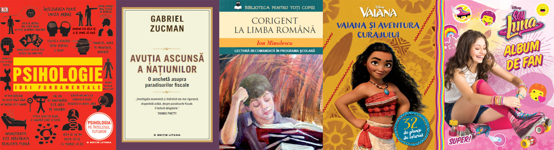 Psihologie. Idei fundamentale; Avuția ascunsă a națiunilor. Anchetă asupra paradisurilor fiscale, de Gabriel Zucman; Corigent la limba română, de Ion Minulescu; Vaiana și aventura curajului. 32 de planșe de colorat, ed. Disney; Soy Luna. Album de fan, ed. Disney.