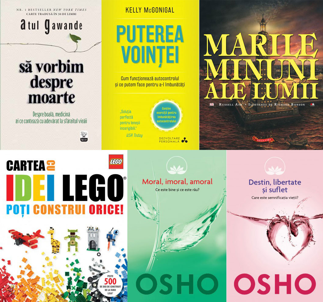 LITERA – Să vorbim despre moarte, de Atul Gawande; Puterea voinței, de Kelly McGonigal; Marile minuni ale lumii, de Russell Ash; Cartea cu idei LEGO. Poți construi orice!; Osho. Moral. Imoral. Amoral: Ce este bine și ce este rău; Osho. Destin, libertate și suflet: Care este semnificația vieții?.