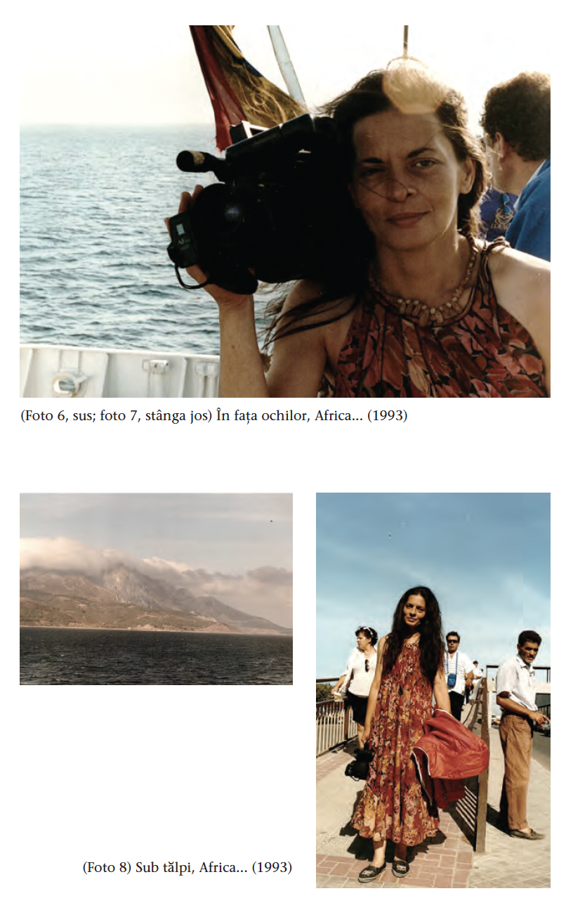 Lăsăm în urmă Gibraltarul, aproape că nici nu vreau să‑l văd, bietul pietroi… La un moment dat începe să se vadă ceva ca o dâră de fum. Mă uit neîncrezătoare și întreb din priviri. Da, e Africa! Munții Atlas! Inima mi s‑a mutat în creier, pe care‑l simt pulsând ca o meduză. Deci poate fi adevărat. Este acolo, în fața mea, din ce în ce mai aproape. Nu sunt în stare să filmez, Wulf îmi ia camera din mână, filmează, face fotografii și, din când în când, se uită la mine cu îngrijorare de parcă s‑ar teme să nu mă dezintegrez.