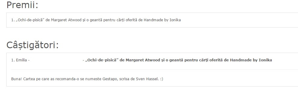 2. Răspundeți printr-un comentariu la acest articol (pe blog, nu pe Facebook) la întrebarea: Care este cartea pe care ați recomanda-o fără rezerve atunci când cineva vă întreabă ce să mai citească?