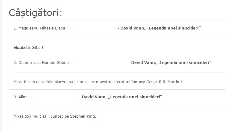 Cel mai bine e să folosiți o adresă de mail validă pe care o verificați în mod constant, întrucât în cazul în care, timp de o săptămână de la anunțare, nu primesc răspuns cu datele de contact, voi alege alt câștigător. Ar fi o idee bună să verificați și căsuța de Spam.
