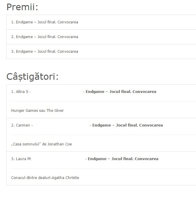Așadar, timp de o săptămână și jumătate, până pe 16 noiembrie, puteți participa la concursul realizat în parteneriat cu Editura Trei la care trei dintre voi pot câștiga câte un exemplar din Endgame – Jocul final. Convocarea. Tot ce trebuie să faceți e să lăsați un comentariu cu răspunsul la întrebarea: Ce carte ți-ar plăcea să joci?