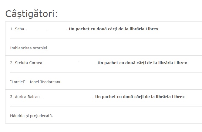 Premiile vor fi expediate de librăria Librex la adrese de pe teritoriul României.