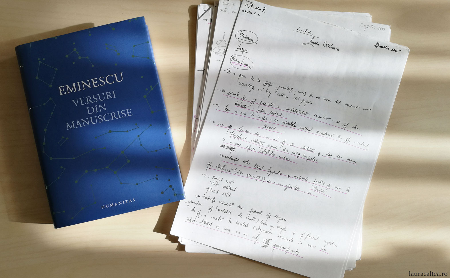 Pentru filologi sunt mai multe astfel de ediții (se numesc ediții critice pentru că au fost întocmite de specialiști care au studiat opera lui Eminescu – cunoscuți chiar sub numele de eminescologi –, și cuprind nu doar poeziile sale, ci și referințe critice pentru fiecare poezie în parte): celebra ediție Perpessicius, ediția Opere complete a Academiei Române sau ediția critică în 5 volume a lui D. Murărașu (pentru mine prima ediție Eminescu pe care am cunoscut-o și am ferfenițit-o încă din școala generală). Astea sunt cele mai cunoscute, dar nu toate, mai există și alte numeroase ediții de manuscrise sau cărți de analiză și interpretare a operei sale (precum studiile lui Dumitru Irimia sau ale Mihaelei Mancaș). Cele mai multe astfel de ediții se mai găsesc mai ales la bibliotecă sau la anticariat.