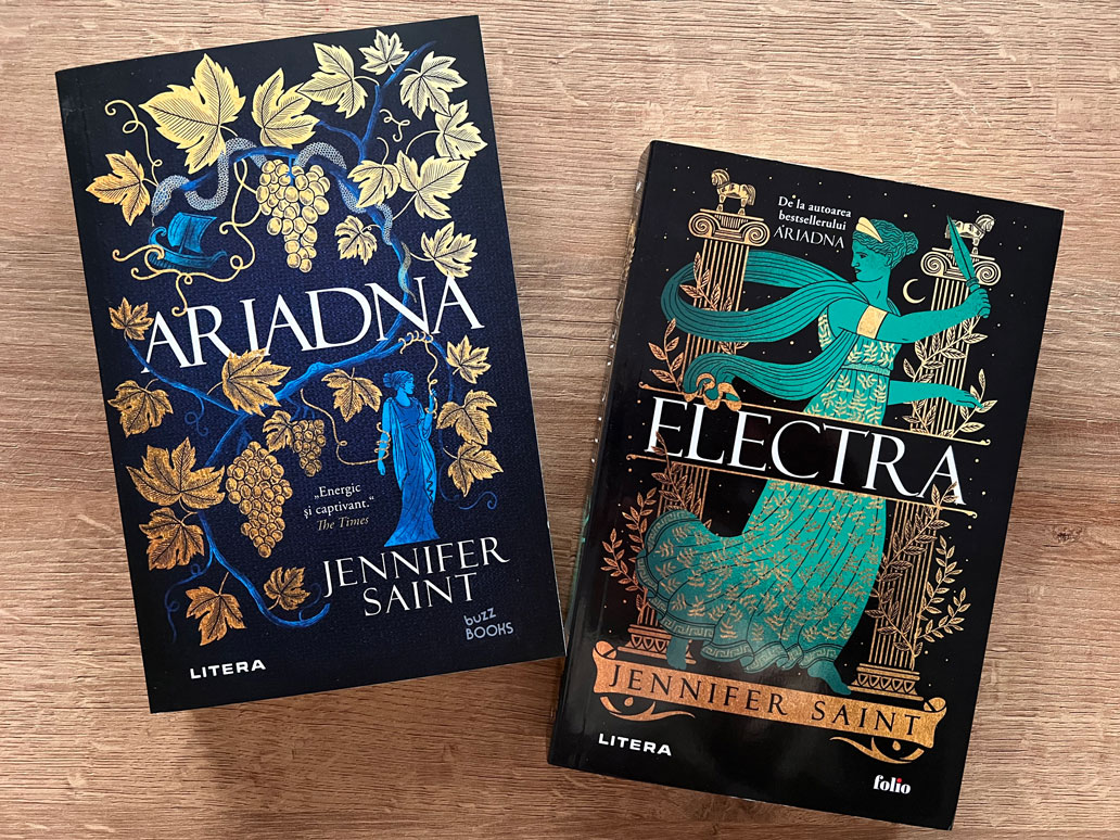 De asemenea, mai menționez și romanele lui Jennifer Saint, AriadnaElectra și Atalanta (toate trei apărute la Editura Litera în traducerea Irinei-Marina Borțoi, primul în 2022, al doilea în 2023, iar cel de-al treilea la începutul acestui an) pe care încă nu le-am citit, dar urmează s-o fac (am început Electra audiobook, dar tot mi-e greu să mă concentrez să ascult ficțiune în căști, momentan mă descurc mai bine cu nonficțiune organizată pe capitole, mai ales istorie sau cultură generală).