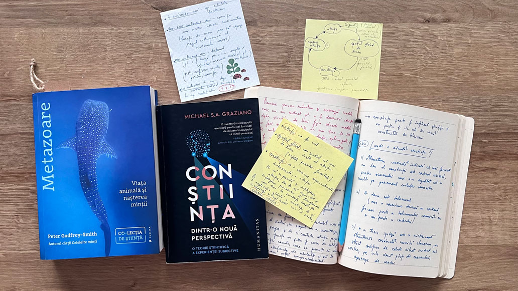 Metazoare nu este prima încercare a lui Peter Godfrey-Smith de a sonda misterele minții și inteligenței, o primă încercare a fost Celelalte minți. Caracatița și evoluția minții inteligente, în care a arătat cum inteligența a cunoscut două căi diferite de dezvoltate, una care a dus la mintea umană și cealaltă la inteligența complexă a caracatiței, cea mai apropiată perspectivă pe care o putem avea (până la o posibilă întâlnire cosmică de gradul III) asupra unui alt tip de inteligență, diferit de al nostru. Metazoare pornește dintr-un punct diferit și este o lucrare mai complexă din multe puncte de vedere, cu o perspectivă mai amplă care mi-a adus aminte de extraordinarul volum Conștiința dintr-o nouă perspectivă. O teorie științifică a experienței subiective, de Michael S.A. Graziano. Pe scurt, ideea de la care pornesc ambii este că putem urmări dezvoltarea conștiinței pornind de la cele mai mici manifestări ale ceea ce ar putea fi considerat o voință, o atenție îndreptată asupra lumii înconjurătoare și că această formă de manifestare nu este exclusiv umană, ci doar a luat o anumită formă în alcătuirea noastră, dar ea există în natură în nenumărate alte forme și stadii. Iar prima sa formă privește unele dintre cele mai rudimentare forme de viață, și anume bureții de mare apăruți acum câteva sute de milioane de ani (vreo 700-600 de milioane de ani, relativ recent, dacă ne gândim că apariția vieții e situată undeva între 4-3,8 miliarde de ani). Atât Godfrey-Smith, cât și Graziano, te obligă să privești cu alți ochi atât natura în întregul ei (și, astfel, să nu mai desconsideri alte forme de viață și, mai ales, să nu le mai ierarhizezi pe o scară evolutivă care ar culmina cu apariția homo sapiens sapiens), cât și evoluția (lentă, extrem de lentă și de improbabilă și de extraordinar de minunată) a inteligenței și a diferitelor forme de conștiință. Ambii fac asta cu mijloace și argumente specifice, iar cărțile se completează foarte bine una pe cealaltă; sunt de citit cu creionul în mână și caietul de notițe alături (la Graziano mi-am făcut și scheme la un moment dat ca să pot ține pasul).