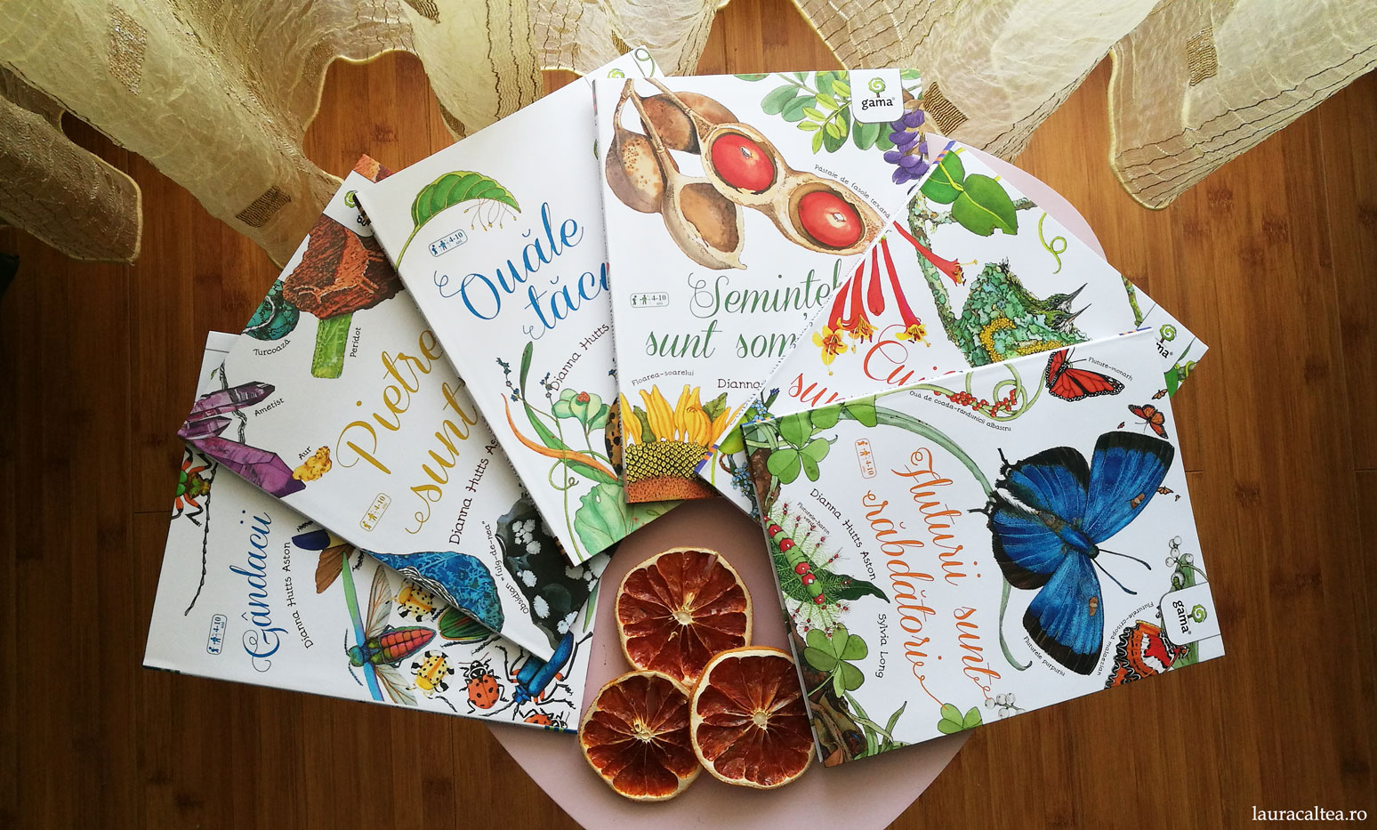 La Editura Gama a apărut de curând o minunată serie de cărți pentru copii, „Magia naturii”, de Dianna Hutts Aston, cu ilustrații Sylvia Long. Seria cuprinde șase cărți: Gândacii sunt sfioși, Cuiburile sunt gălăgioase, Fluturii sunt răbdători, Semințele sunt somnoroase, Ouăle sunt tăcute, Pietrele sunt vii, fiecare cu câte 40 de pagini și coperte broșate, dar cu forzaț (adică sunt undeva între broșat și cartonat).