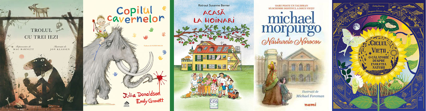 • Copilul cavernelor, de Julia Donaldson: „Niciodată imaginația copiilor n-a putut fi ținută în frâu și poate că tocmai datorită libertății și creativității nenumăraților Pui-de-Om de-a lungul timpului nu mai suntem azi in epoca de piatră.” (Ed. Cartea Copiilor; trad. Florin Bican; il. Emily Gravett)