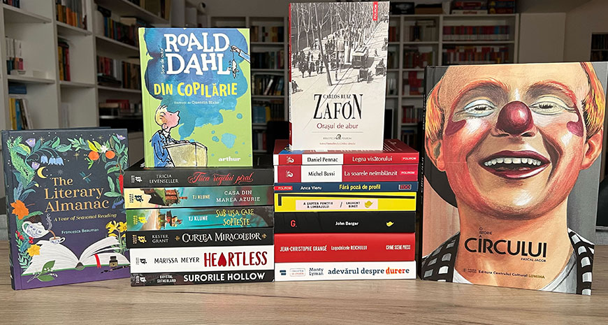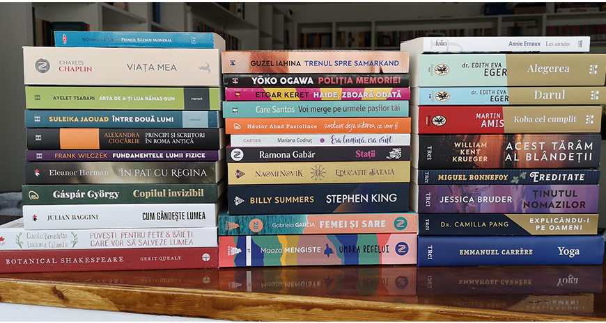 • Marea liniștii, de Emily St. John Mandel: „…un roman despre artă, timp, iubire și pandemie, care îl poartă pe cititor de pe Insula Vancouver, în 1912, până într-o colonie întunecată de pe Lună, aproape cinci sute de ani mai târziu, prin intermediul unei povești despre umanitate, derulate în timp și spațiu.” (Ed. Trei; trad. Mariana Piroteală)