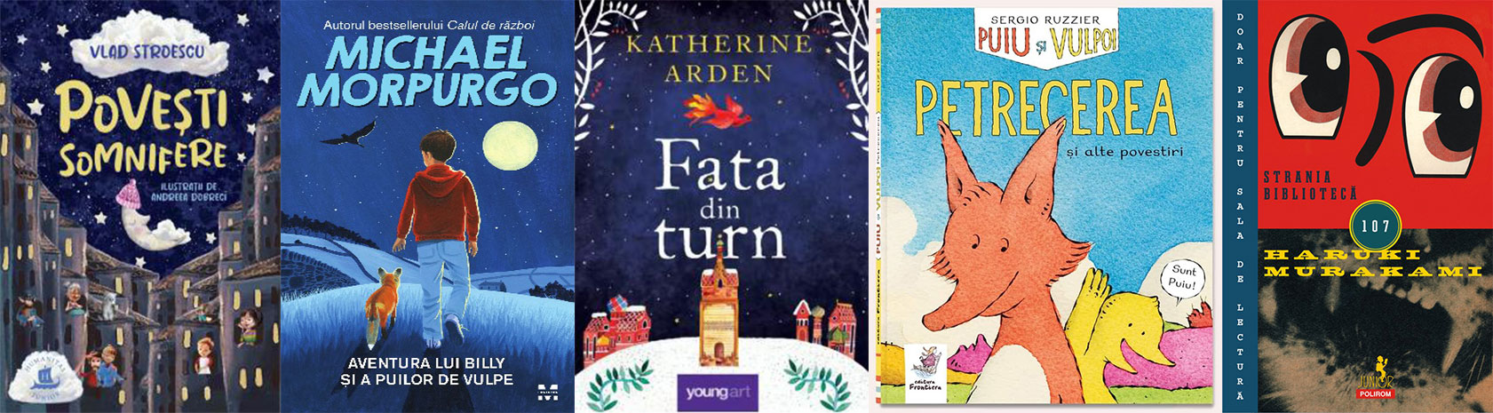 Povești frumoase și frumos ilustrate pentru copii mici la Editura Frontiera – Puiu și Vulpoi. Petrecerea și alte povestiri, de Sergio Ruzzier, Serafim și mașinăriile fermecate, de Philipe Fix, și Editura Cartea Copiilor – O poveste întârziată, de Marianna Coppo, Băiatul acela, Emil, de Astrid Lindgren, Schimbare de aer, de Jeanne Macaigne. Iar pentru copii mai mari, la Editura Arthur: Sora lui Colăcel, de Lavinia Braniște; Băiatul care a înotat cu piranha, de David Almond; Vine vacanța cu trenul din Franța, de Adina Popescu.