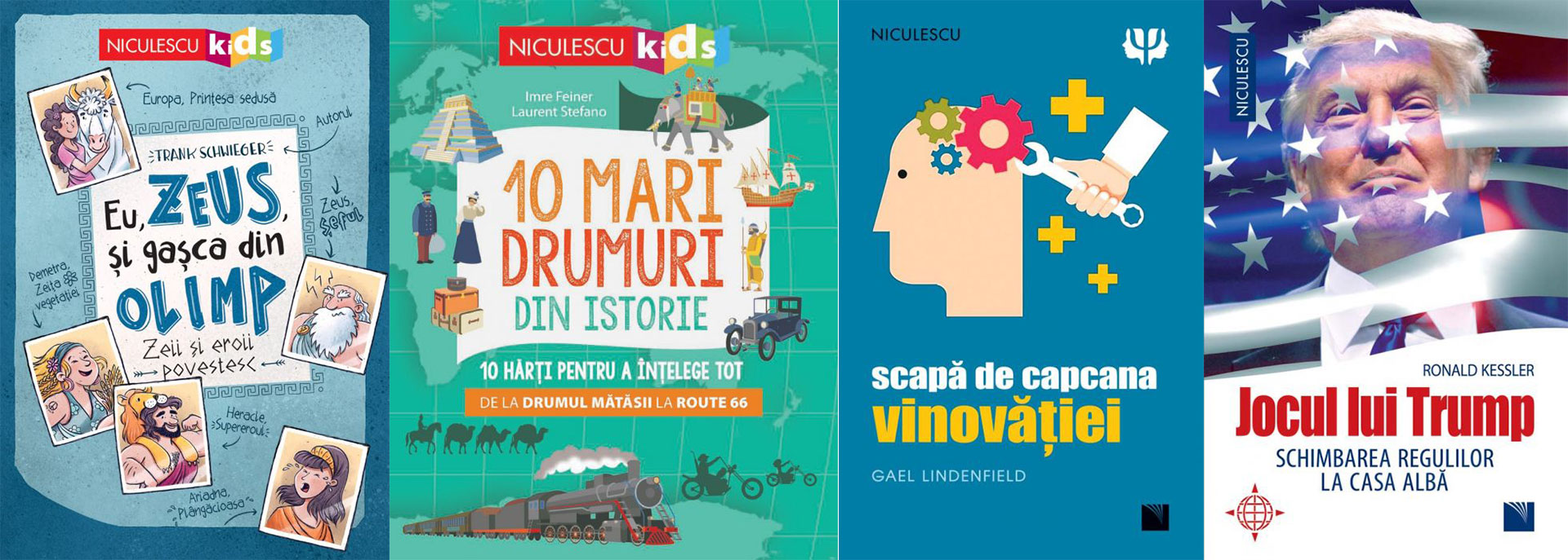 Eu, Zeus, și gașca din Olimp. Zeii și eroii povestesc, de Frank Schwieger; 10 mari drumuri din istorie. 10 hărți pentru a înțelege tot de la Drumul Mătăsii la Route 66, de Imre Feiner, Laurent Stefano; Scapă de capcana vinovăției, de Gael Lindenfield; Jocul lui Trump. Schimbarea regulilor la Casa Albă, de Ronald Kessler
