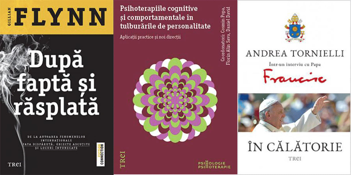 După faptă și răsplată, de Gillian Flynn; Psihoterapiile cognitive și comportamentale în tulburările de personalitate. Aplicații practice și noi direcții, de Cosmin Popa, Florin Alin Sava, Daniel David; În călătorie. Andrea Tornielli într-un interviu cu Papa Francisc, de Andrea Tornielli.
