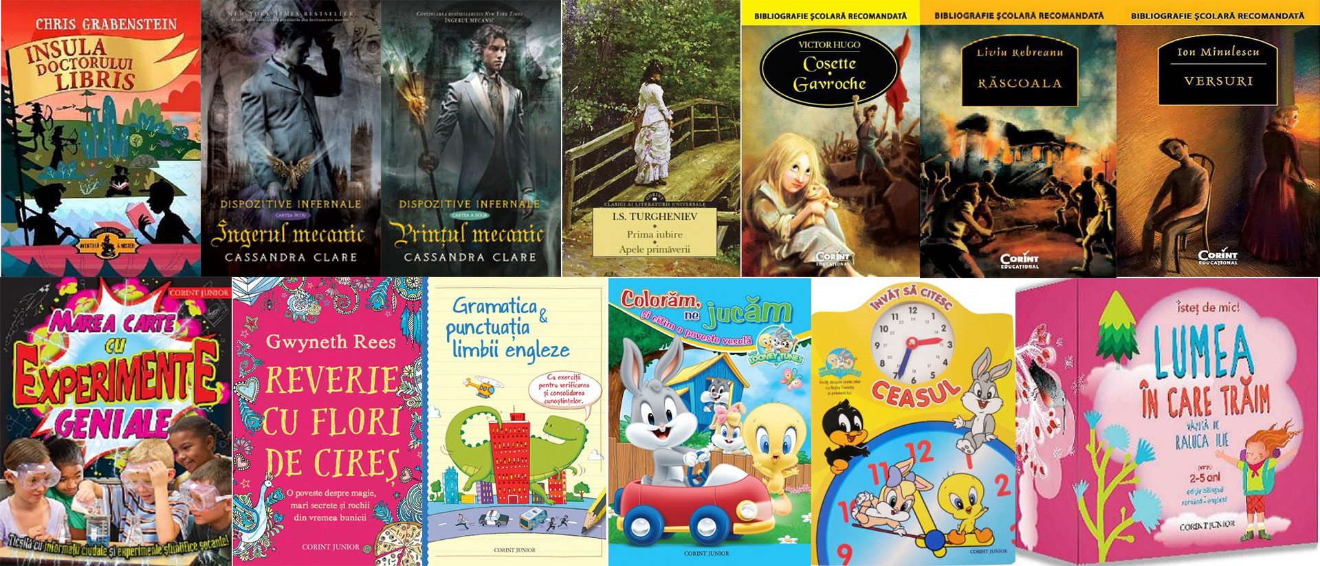 Marea carte cu experimente geniale; Reverie cu flori de cireş, de Gwyneth Rees; Îngerul mecanic (Dispozitive infernale, cartea întâi), de Cassandra Clare; Prințul mecanic (Dispozitive infernale, cartea a 2-a), de Cassandra Clare; Gramatica & punctuaţia limbii engleze; Prima iubire. Apele primăverii, de I.S. Turgheniev; Cosette. Gavroche, de Victor Hugo; Răscoala, de Liviu Rebreanu; Versuri, de Ion Minulescu; Insula doctorului Libris, de Chris Grabenstein; ISTEŢ DE MIC! Lumea în care trăim, de Raluca Ilie; Baby Looney Tunes. Colorăm, ne jucăm şi citim o poveste veselă; Învăţ să citesc ceasul cu Baby Looney Tunes.