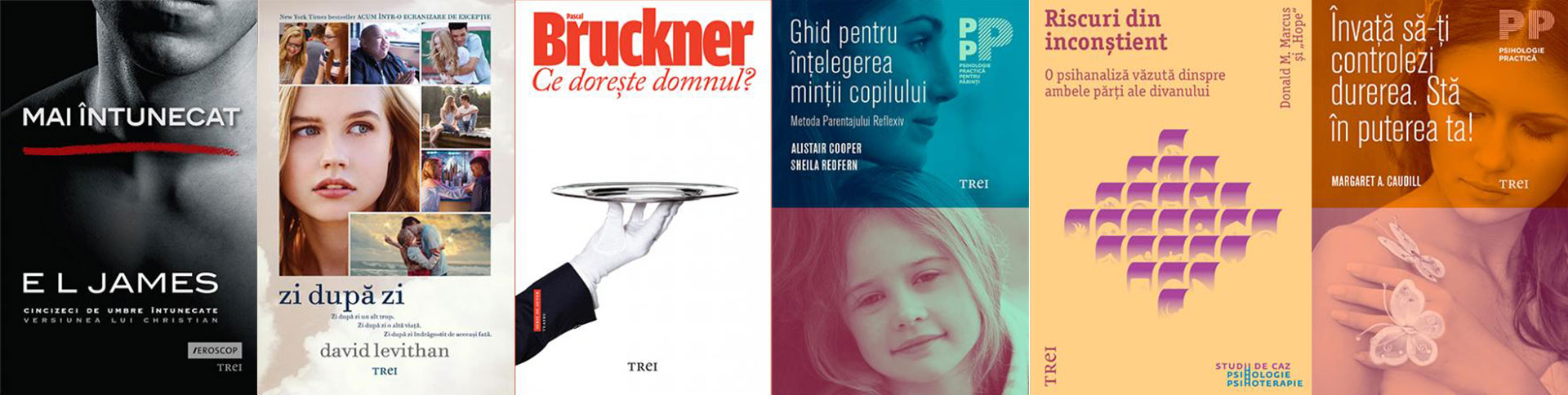 Mai întunecat, de E L James; Zi după zi, de David Levithan; Ce dorește domnul?, de Pascal Bruckner; Ghid pentru înțelegerea minții copilului. Metoda Parentajului Reflexiv, de Alistair Cooper, Sheila Redfern; Riscuri din inconștient. O psihanaliză văzută dinspre ambele părți ale divanului, de Donald M. Marcus; Învaţă să-ţi controlezi durerea. Stă în puterea ta!, de Margaret A. Caudill.