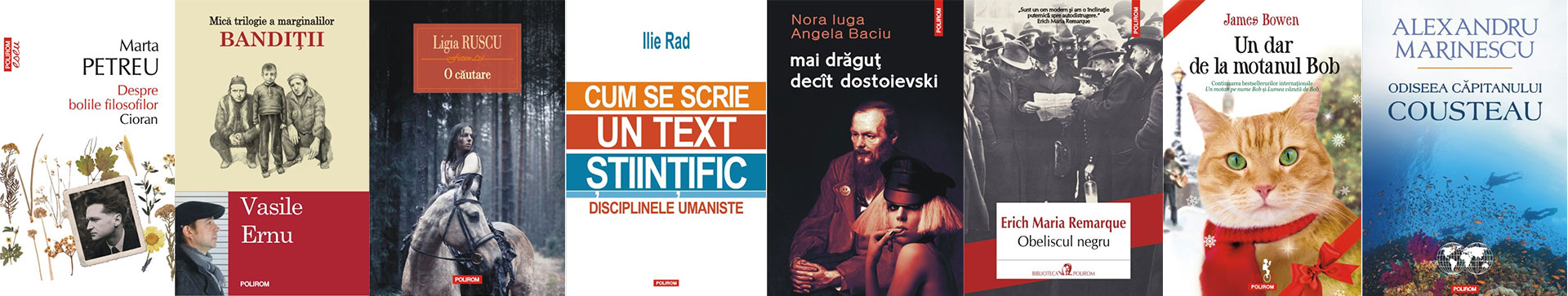 Despre bolile filosofilor. Cioran, de Marta Petreu; Bandiții, de Vasile Ernu; O căutare, de Ligia Ruscu; Cum se scrie un text științific. Disciplinele umaniste, de Ilie Rad; mai drăguț decît dostoievski, de Nora Iuga și Angela Baciu; Obeliscul negru, de Erich Maria Remarque; Un dar de la motanul Bob, de James Bowen; Odiseea căpitanului Cousteau, de Alexandru Marinescu.