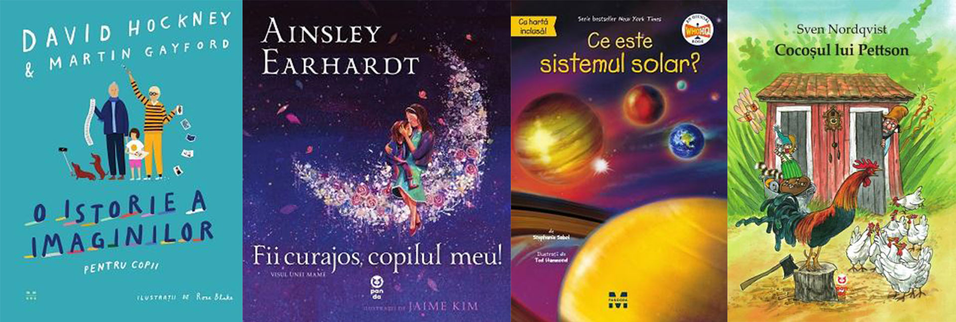 O istorie a imaginilor pentru copii, de David Hockney, Martin Gayford; Fii curajos, copilul meu! Visul unei mame, de Ainsley Earhardt; Ce este sistemul solar?, de Stephanie Sabol; Cocoșul lui Pettson (Seria „Pettson și Findus”), de Sven Nordqvist.