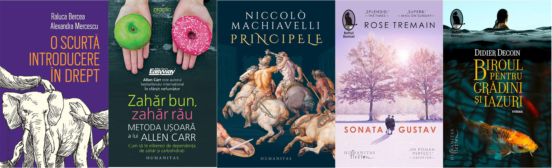 O scurtă introducere în drept, de Alexandra Mercescu, Raluca Bercea; Fals tratat de manipulare, de Ana Blandiana; Făurari şi alchimişti, de Mircea Eliade; Zahăr bun, zahăr rău. Metoda ușoară a lui Allen Carr. Cum să te eliberezi de dependența de zahăr și carbohidrați, de Allen Carr; Principele, de Niccolò Machiavell; Sonata Gustav, de Rose Tremain; Biroul pentru Grădini și Iazuri, de Didier Decoin.