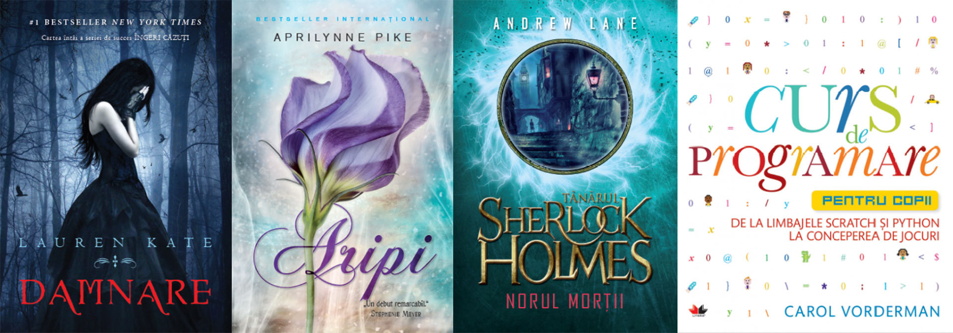 Damnare, de Lauren Kate; Aripi, de Aprilynne Pike; Tânărul Sherlock Holmes. Norul morții, de Andrew Lane; Curs de programare pentru copii. De la limbajele Scratch și Python la conceperea de jocuri, de Carol Vorderman.