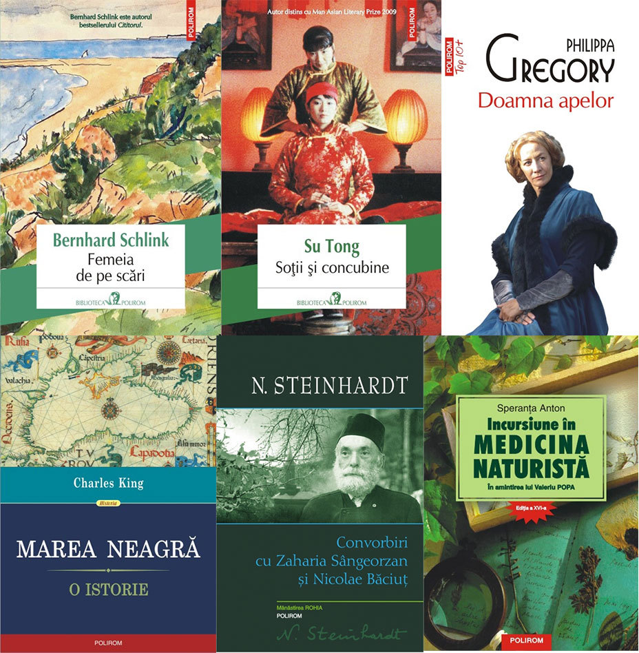 POLIROM – Marea Neagră. O istorie, de Charles King; Femeia de pe scări, de Bernhard Schlink; Soții și concubine, de Tong Su; Convorbiri cu Zaharia Sângeorzan și Nicolae Băciuț, de N. Steinhardt; Doamna apelor, de Philippa Gregory; Incursiune în medicina naturistă. În amintirea lui Valeriu Popa, de Speranța Anton.