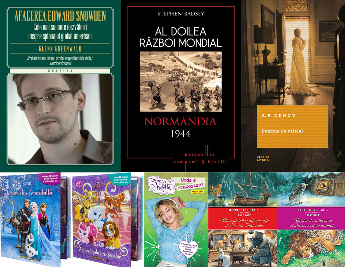 LITERA – Afacerea Edward Snowden. Cele mai şocante dezvăluiri despre spionajul global american, de Glenn Greenwald; Al Doilea Război Mondial. Normandia 1944, de Stephen Badsey; Doamna cu căţelul, de A.P. Cehov; Mica sirenă şi alte poveşti de H. Ch. Andersen, Hans Christian Andersen, Tony Wolf; Greierele şi furnica şi alte poveşti cu animale, Tony Wolf; Citeşti şi te joci. Jocuri din Arendelle, Disney; Citeşti şi te joci. Animaluţele prinţeselor, Disney; Violetta. Unde e dragostea?, Disney.