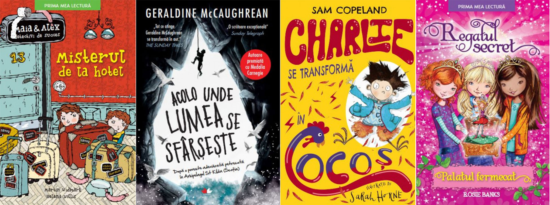 Misterul diamantelor. Maia și Alex, detectivi de succes, de Martin Widmark, Helena Willis; Acolo unde lumea se sfărșește, de Geraldine McCaughrean; Charlie se transformă în cocoș, de Sam Copeland; Regatul secret. Palatul fermecat, de Rosie Banks.