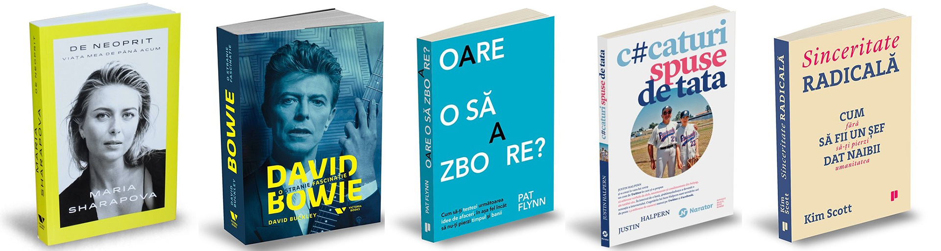 De neoprit. Viața mea de până acum, de Maria Sharapova, Rich Cohen; David Bowie: o stranie fascinație, de David Buckley; Oare o să zboare? Cum să-ți testezi următoare idee de afaceri, în așa fel încât să nu-ți pierzi timpul și banii, de Pat Flynn; C#caturi spuse de tata, de Justin Halpern; Sinceritate radicală. Cum să fii un șef dat naibii fără să-ți pierzi umanitatea, de Kim Scott.