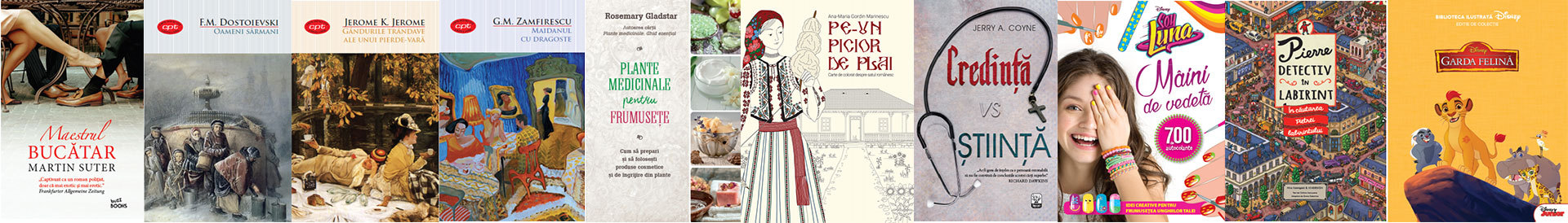 Maestrul bucătar, de Martin Suter; Oameni sărmani, de F.M. Dostoievski; Gândurile trândave ale unui pierde-vară, de Jerome K. Jerome; Maidanul cu dragoste, de George Mihail Zamfirescu; Plante medicinale pentru frumusețe, de Rosemary Gladstar; Tony & Susan, de Austin Wright; Pe-un picior de plai. Carte de colorat despre satul românesc, de Ana-Maria Gordin Marinescu; Credință vs Știință, de Jerry A. Coyne; Soy Luna. Mâini de vedetă, ed. Disney; Pierre. Detectiv în labirint, de Chihiro Maruyama; Garda felină. Biblioteca ilustrată, ed. Disney; Elena din Avalor. Aventurile unei prințese, ed. Disney; Sofia Întâi. Primele mele 150 de cuvinte în limba engleză, ed. Disney.