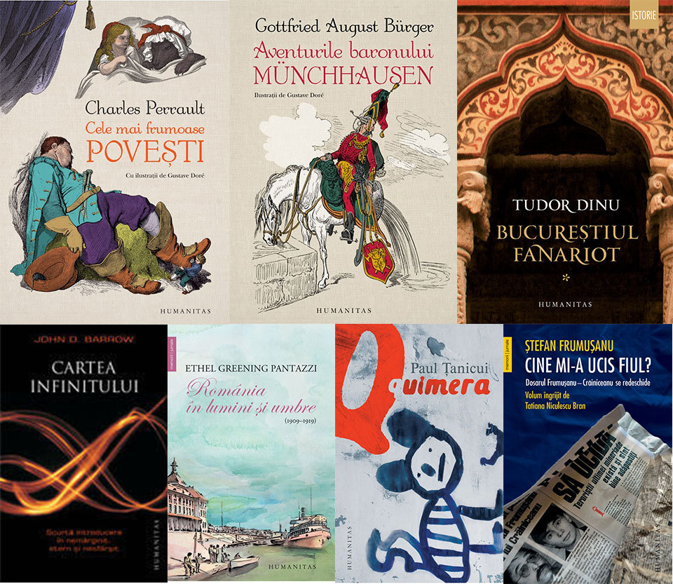 HUMANITAS – Cartea infinitului. Scurtă introducere în nemărginit, etern şi nesfârşit, de John D. Barrow; Cele mai frumoase povești. Cu ilustrații de Gustave Doré, de Charles Perrault; Aventurile baronului Münchhausen. Cu ilustrații de Gustave Doré, de Gottfried August Bürger; Tragedia Germaniei. 1914-1945, de Lucian Boia; Bucureștiul fanariot I. Biserici, ceremonii, războaie, de Tudor Dinu; România în lumini și umbre (1909-1919), de Ethel Greening Pantazzi; Quimera, de Paul Țanicui; Cine mi-a ucis fiul? Dosarul Frumușanu-Crăiniceanu se redeschide. Volum îngrijit de Tatiana Niculescu Bran, de Ștefan Frumușanu; Horea în grumaz. Înger păzitor și ispită, de Grigore Leșe.