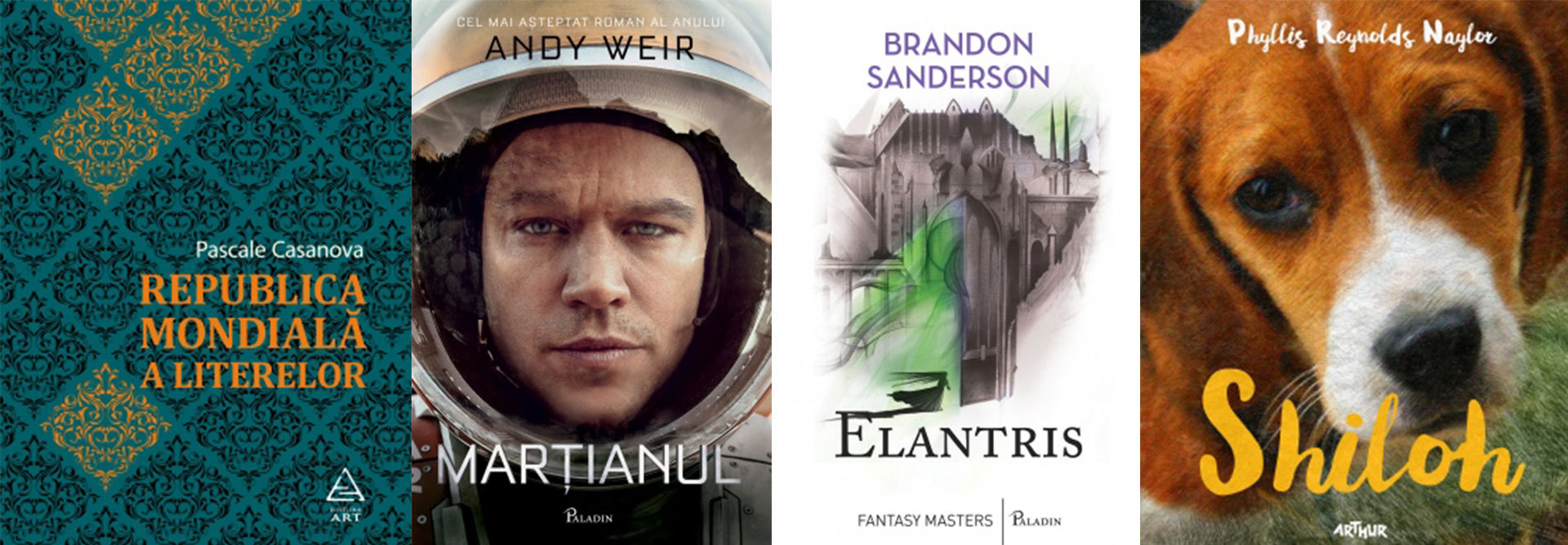 Republica Mondială a Literelor, de Pascale Casanova; Marțianul (ediție paperback), de Andy Weir; Elantris, de Brandon Sanderson; Shiloh, de Phyllis Reynolds Naylor.