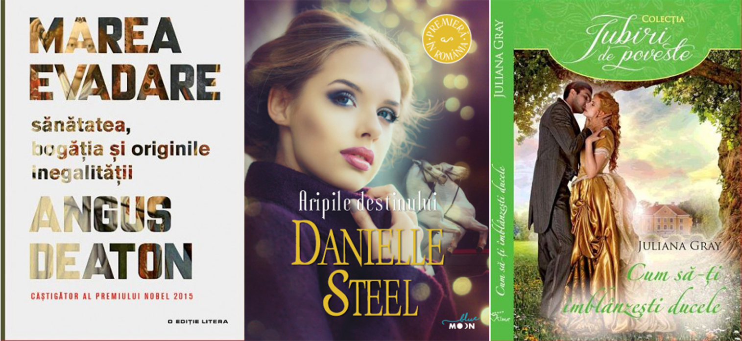 Marea evadare. Sănătatea, bogăția și originile inegalității, de Angus Deaton; Aripile destinului, de Danielle Steel; Cum să-ți îmblânzești ducele, de Juliana Gray.