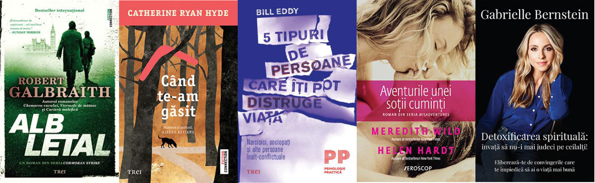Alb letal, de Robert Galbraith; Când te-am găsit, de Catherine Ryan Hyde; 5 tipuri de persoane care îți pot distruge viața. Narcisici, sociopați și alte persoane înalt-conflictuale, de Bill Eddy; Aventurile unei soții cuminți, de Meredith Wild, Helen Hardt; Detoxifierea spirituală, de Gabrielle Bernstein.