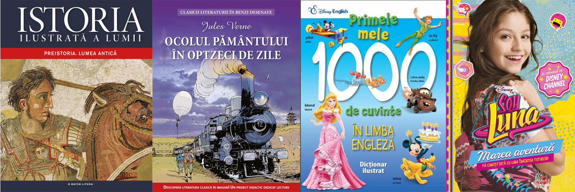 Istoria Ilustrată a lumii: Preistoria. Lumea antică (volumul 1); Ocolul pământului în 80 de zile, de Jules Verne (Clasicii literaturii universale în benzi desenate); Primele 1000 de cuvinte în limba engleză. Dicţionar ilustrat, ed. Disney; Soy Luna. Marea aventură, ed. Disney.