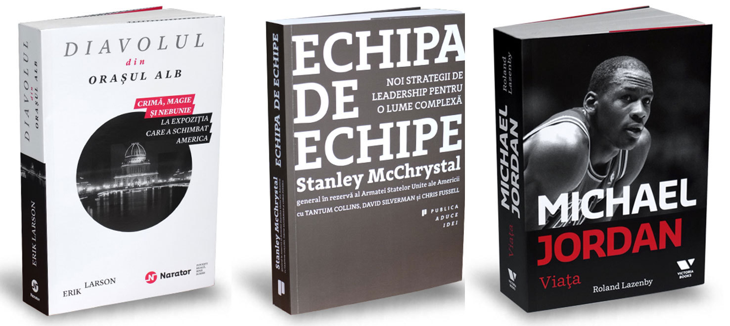 Diavolul din oraşul alb. Crimă, magie şi nebunie la expoziţia care a schimbat America, de Erik Larson; Echipa de echipe. Noi strategii de leadership pentru o lume complexă, de Chris Fussell, David Silverman,Stanley Mcchrystal, Tantum Collins; Michael Jordan. Viaţa, de Roland Lazenby.